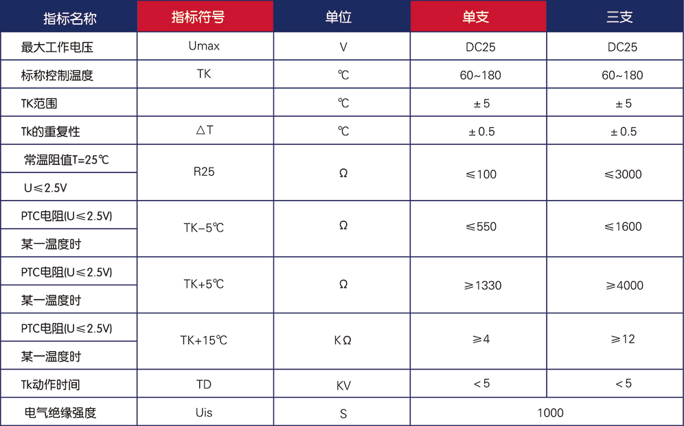 PTC熱敏電阻傳感器符合德國DIN44081和DIN44082標(biāo)準(zhǔn)??刂茰囟确秶鸀門K60℃~TK180℃??刂茰囟萒K每間隔5℃設(shè)定。